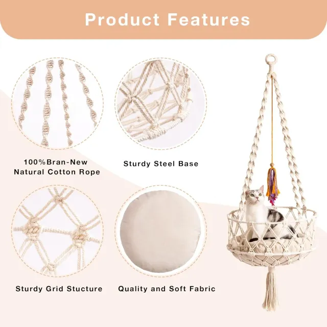 - Sturdy: Boho macrame cat hammock bed is made of 100% natural high-quality cotton rope,the rope is thick and soft, with a long front and a short back, stable double steel hoop base, The bottom of the hanging cat bed is supported by a metal frame, it can keep balance and reduce swing, it’s very safe for your cats.
