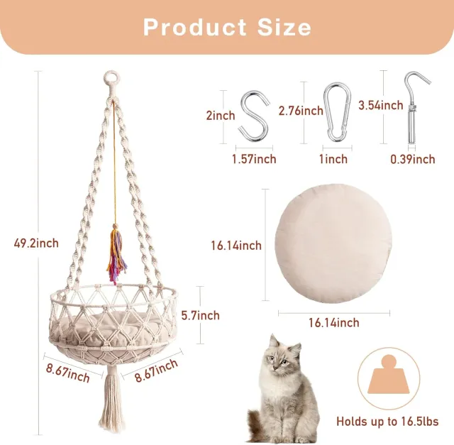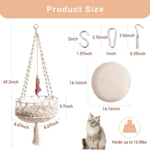 - Multi-location Use: The perfect gift for cats or cat lovers. The Boho macrame cat swing bed can become a lovely decor in your home. You can hang it anywhere on the wall or in front of the window, or add it to your living room as a beautiful piece. Your furry kids will also happily turn this bed that’s warm and comfortable into their favorite spot.